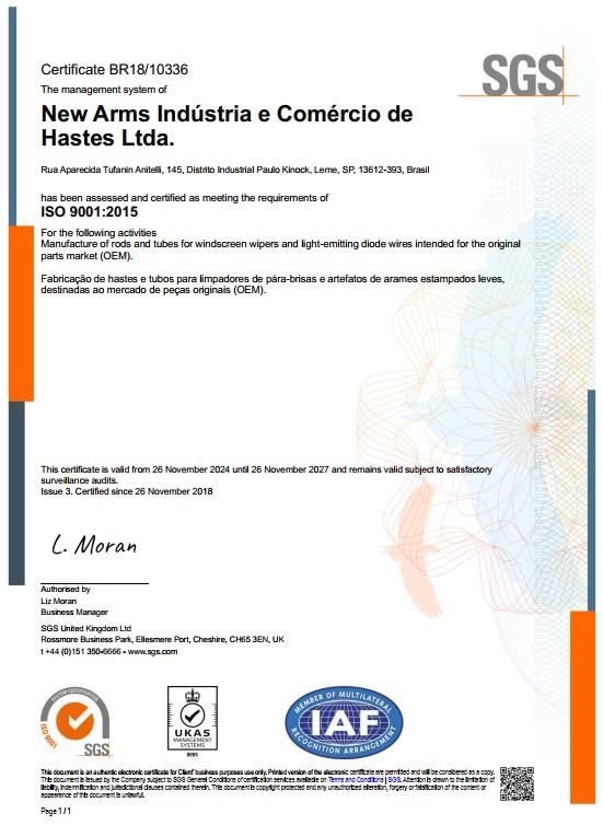A New Arms Metalúrgica possui o Certificado ISO 9001:2015, uma das normas de gestão da qualidade mais reconhecidas mundialmente. Essa conquista demonstra o compromisso da empresa em manter processos padronizados, eficientes e em conformidade com os mais altos padrões do setor metalúrgico. O certificado garante que cada etapa da produção, desde o recebimento da matéria-prima até a entrega final, seja acompanhada de rigoroso controle de qualidade, oferecendo segurança e confiabilidade aos clientes.