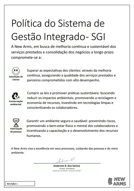 Com foco em inovação, sustentabilidade e eficiência, o SGI da New Arms reforça o compromisso em atender e superar as expectativas de seus clientes, colaboradores e parceiros. Essa dedicação ao aprimoramento contínuo consolida a empresa como referência no setor metalúrgico, oferecendo soluções sob medida que agregam valor, competitividade e responsabilidade em cada projeto.